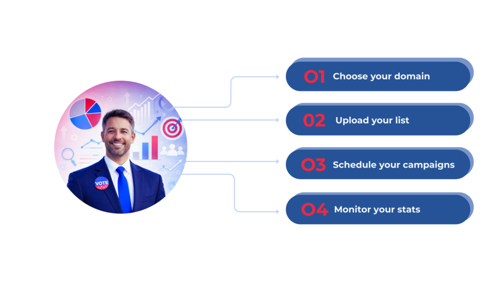Most email tools aren’t optimized for political email at scale. When you push high-volume outreach campaigns performance drops fast. Bounces increase, inbox placement declines, and provider restrictions kick in.